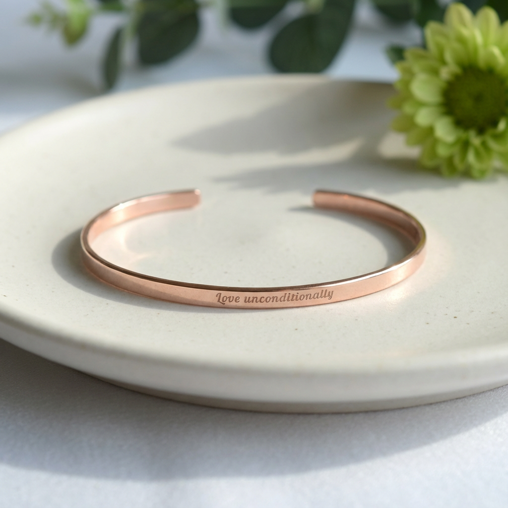A slim copper cuff bracelet engraved with your personal mantra – a simple everyday reminder you can carry on your wrist.