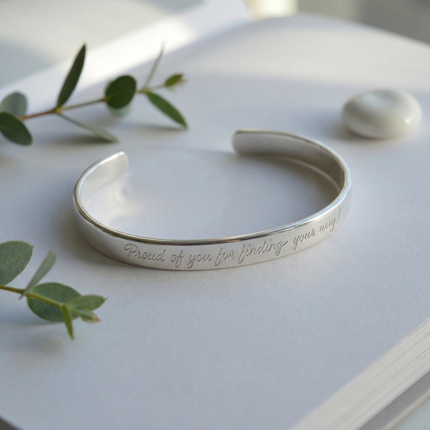 This personalized Sterling Silver 925 graduation bracelet is a meaningful way to celebrate an important milestone with a lasting keepsake. Handcrafted and engraved with your chosen quote, coordinates, handwriting, or special message, this elegant cuff bracelet makes a thoughtful graduation gift and a timeless piece to treasure for years to come.